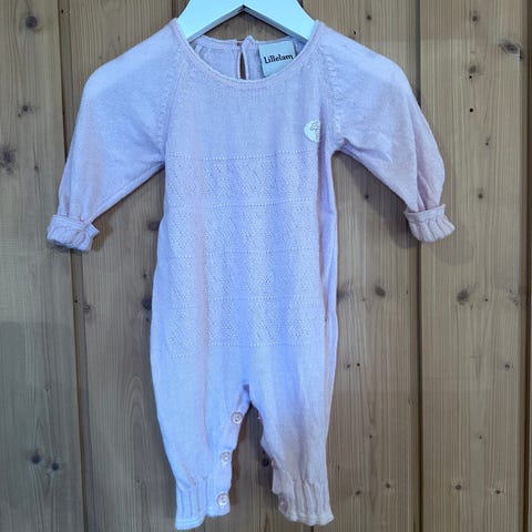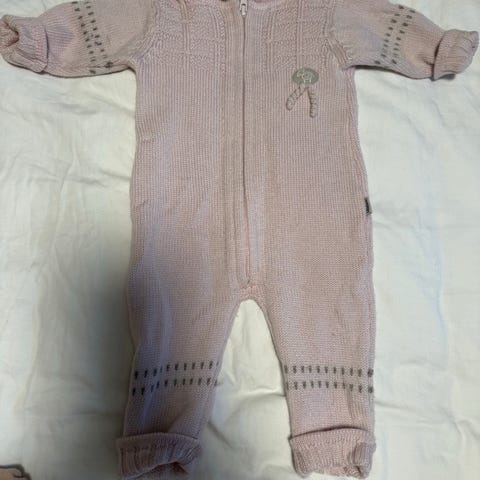 Lillelam ull heldress og lue i størrelse 62 for jente. Plagget er laget av ull og har rosa farge. Passer for små barn og gir varme og komfort.