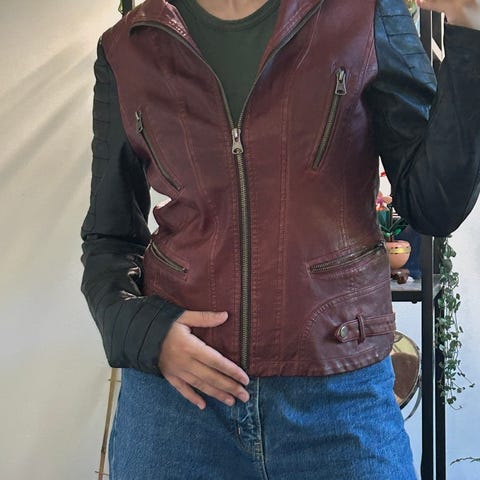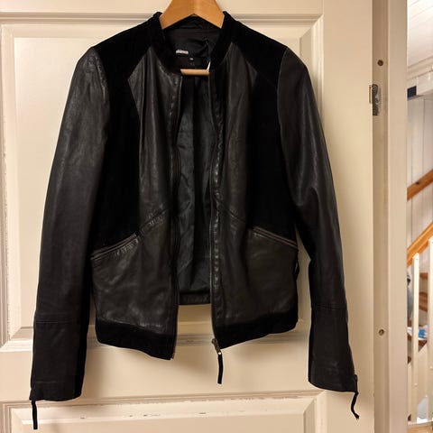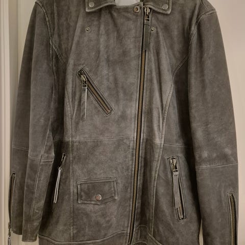 Pent mørke blå skinnjakke.Veldig myk.Pent og lite brukt,kan ikke se noen anmerkninger.Ser ut mye bedre enn på bilde.Samsket skinn farge er samme som skinn farge,men for ikke rett farge på bilde.Jakken er Str 38 ,men liten I størrelse, så tilsvarer mer Str 36.