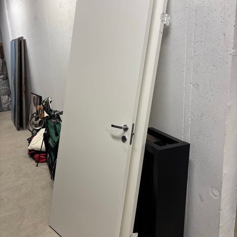 Innerdør i hvit glatt utførelse med mål 90x210 cm. Passer til bruk som innvendig dør i bolig eller kontor. Døren har standard høyde og bredde for enkel montering. Dørhåndtak medfølger ikke. Gis bort mot henting.