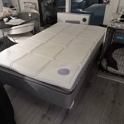 Hele tiden hatt tykk overmadrass over. I god stand. Selges billig pga overgang til større seng.