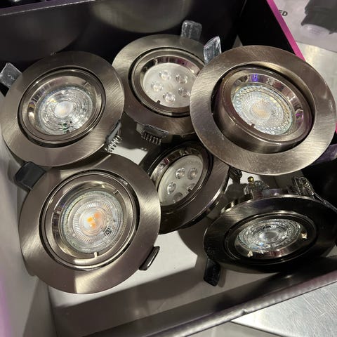 Selger 3 ubrukte innfelte spotter/downlights i hvit. Justerbar vinkel, med fjærfester for enkel montering i tak. Passer standard spotpærer. Fremstår i god stand.