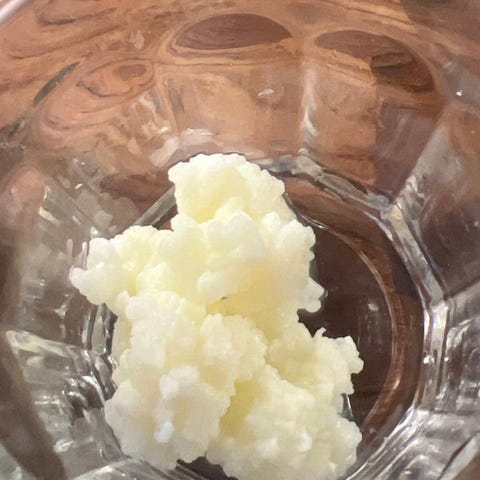 6. Etter hvert som kefirkornene øker i antall, tar du bort de du ikke trenger for å lage ny kefir, og oppbevarer de ekstra kefirkornene i melk i et tett glass, og i kjøleskapet. Der kan de oppbevares i ukesvis, men sjekk konsistensen på melken, slipp ut gass som dannes, og skift melken underveis hvis det skal stå lengre.