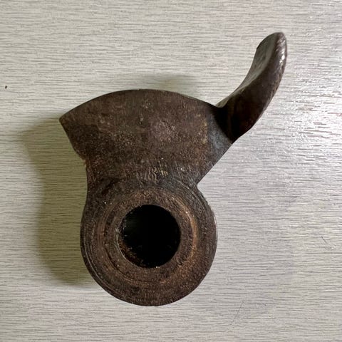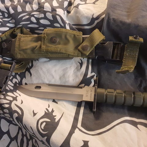 Pack & Co bajonett kniv med metallblad og metallslire. Kniven har et svart håndtak med riflet grep. Sliren er laget av metall og viser preg av bruk og alder.