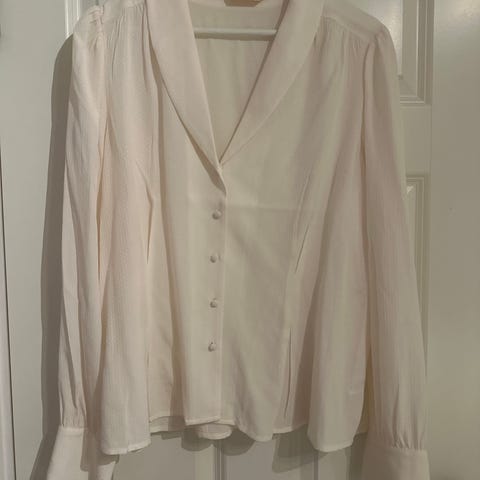 Camilla Pihl bluse i størrelse XL. Blusen er rosa med et mønster av små blomster. Den har lang erm.