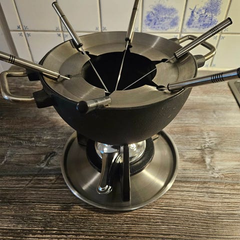Masterclass Fonduesett Støpejern 21x18cm 1.3L. 6 fargekodete fonduegafler. Kan brukes både med sprit og alle varmekilder inkl induksjon. Sort. Kjøpt Traktøren julen 2022/2023. Brukt 2 ganger og ingen synlige bruksmerker. Ny 899,-