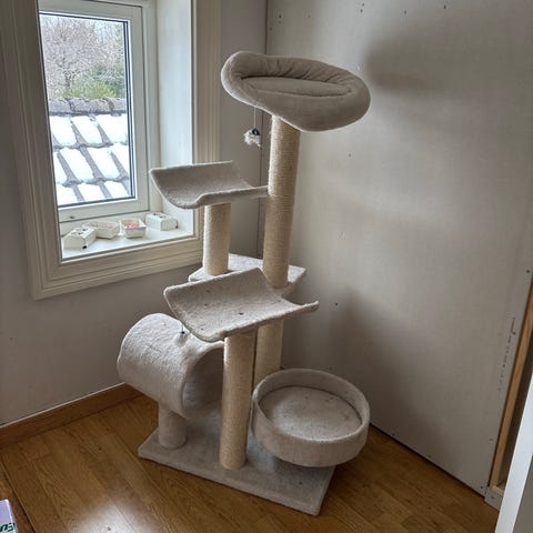 Katt klatrestativ med to runde plattformer, dekket med lyst stoff. Stativet har flere klorestolper og er utstyrt med hvite lekedusker festet til toppen. Passer for katter som trenger klatremuligheter og lek.
