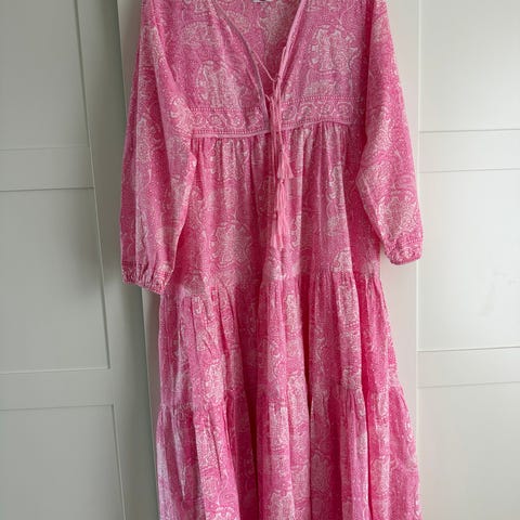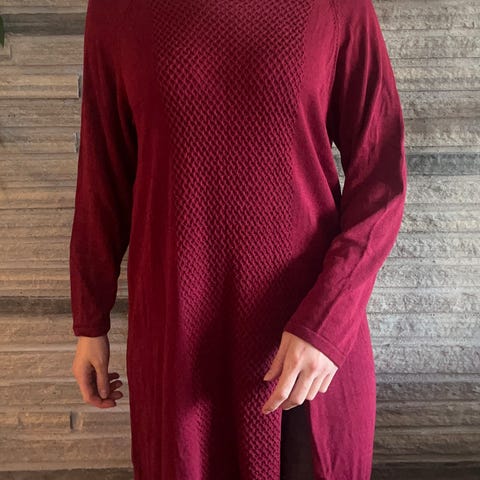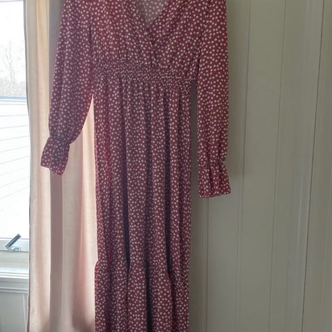 Hverdagskjole i størrelse L, laget av bomull. Kjolen har rød farge og er designet for kvinner. Den har et mønstret stoff og lange ermer med knappedetaljer. Kjøpt i Frankrike. Aldri brukt