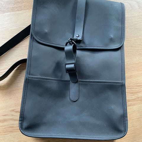 Rains ryggsekk laget av kunstlær, designet for unisex bruk. Sekken har justerbare stropper og en lukking med spenne. Innvendig er det et rom med borrelås for ekstra organisering. Fargen er mørk blå, men ser veldig svart ut. Fint med to rom inni sekken og en liten lomme med glidelås ved ryggen som gjør at man kan legge nøkler og mobil der.