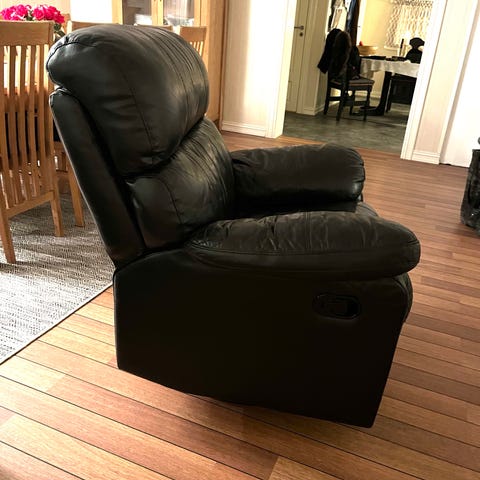 Godt men pent brukt lenestol/reclainer hvor du kan brette deg nesten helt horisonalt ut for liggestilling. God, myk og fleksibel både å sitte og ligge i. Utløser på side for å få fothvileren ut, men må bruke litt mer krefter for å få den inn/ned igjen, uten at det er ett stort problem. Ryggen legges bakover ved å presse deg bakover, du må bruke litt krefter på å få den fremover uten at det er ett stort problem :-) Ellers i god stand og ingen synlige store merker av noe slag, kun vanlige bruksmerker som bildene viser. Veldig enkel å holde ren. Litt uhendig å flytte på, bør gjerne være to pga størrelsen/målene. Må hentes på vår adresse på Kongsberg.