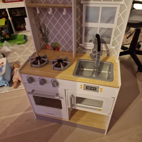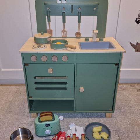 Følger med kjele, stekepanne, tallerkner, kopper, s&p-bøsser, bestikk og kjøkkenredskaper. «Ovn» på ene siden, «oppvaskmaskin» på andre. Lager freselyd på knappen på toppen.