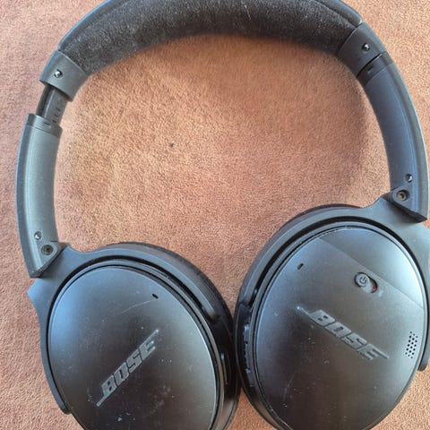 Logitech trådløse hodetelefoner i svart lyd og mikrofon fungerer enda bra( uten øreputer).Bose Mikro USB ladekabel følger ikke med veske til hodetelefoner.Svakt batteri