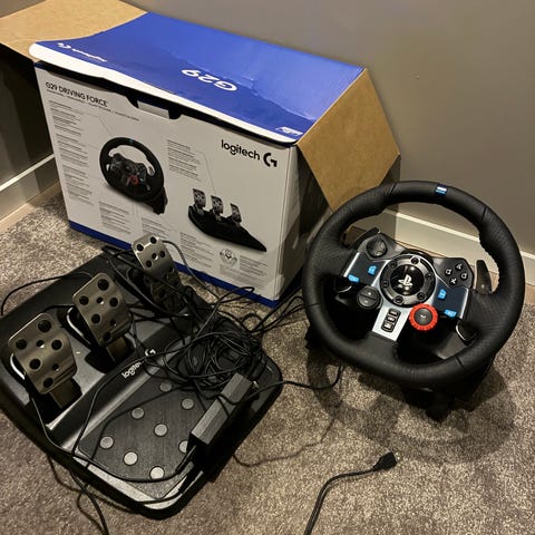 Logitech G29 racingratt med tilhørende pedalsett og girspak designet for bruk med spillkonsoller og PC for racing- og kjøreopplevelser.
