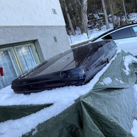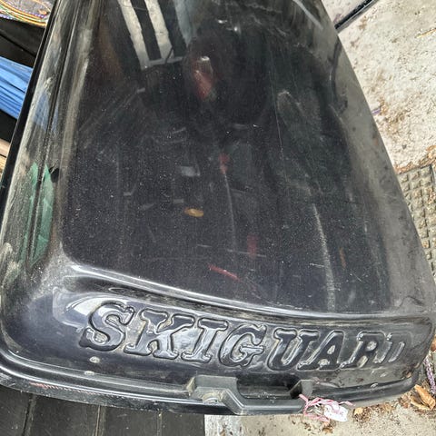 Skiguard 850 takboks i svart farge. Takboksen er designet for oppbevaring og transport av skiutstyr og annet utstyr på taket av bilen. Materialet og størrelsen er ikke spesifisert, men boksen har flere bruksområder for transportbehov. Noen riper og en del farger falmer. Følger med nøkkel.