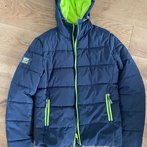 Varm vinterjakke fra superdry i str. s. Et lite hull på den ene armen. Ellers i grei stand. Se bilde.