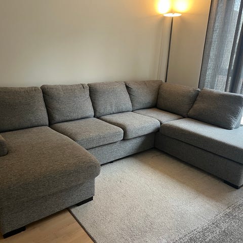 Grå sofa fra Skeidar. Godt brukt, men ingen flekker. Ser veldig fin ut. L: 330 cm. Hø side: 200/80 cm. Ve side: 145/80 cm. Avstand i midten: 145 cm. Deles i deler, så grei å flytte. Kan ta av putetrekk. Bud mottas.