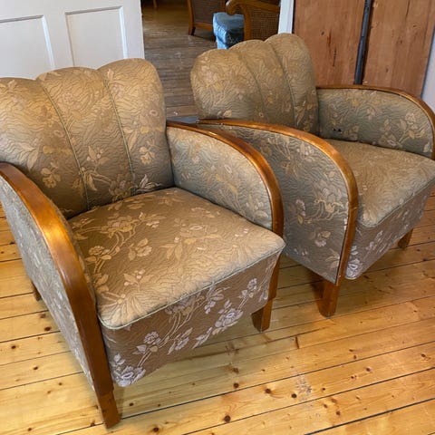 Stoler: B: 63 cm, D: 73 cm, Rygghøyde: 71 cm, Sittehøyde ca 42 cm