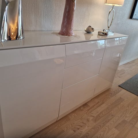 Strøken spisestue i beiset eik, inkl skjenk. Skjenken har 4 skuffer og 4 skap.