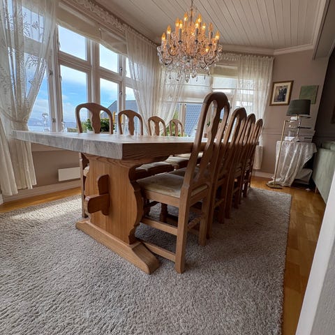 Stoler og understell bord er heltre, ellers finert eik