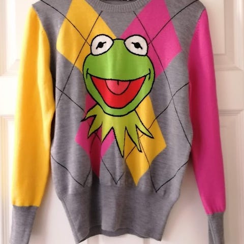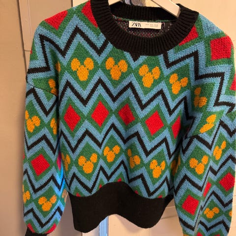 Mikke Mus genser for dame i størrelse S. Genseren er grønn med stort Mikke Mus-motiv på ryggen og har rund hals. Ermene er lange med noe lav skuldersøm for en løsere passform. Passer til hverdagsbruk og kan kombineres med både jeans, skjørt og andre casual plagg.