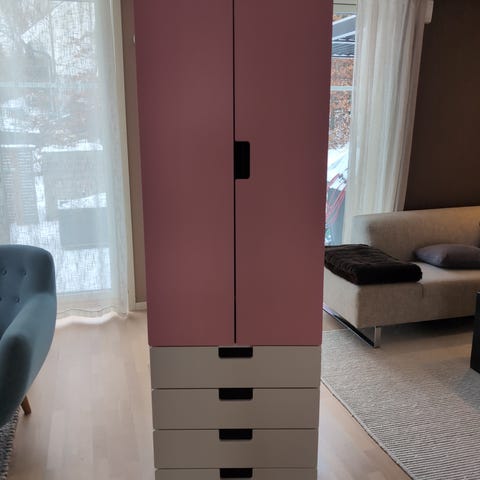 IKEA barneklærskap i hvit farge med dekorative motiver. Skapet har to dører og to skuffer nederst. Innvendig er det en klesstang for oppheng av klær. Egnet for oppbevaring av barneklær og annet tilbehør.