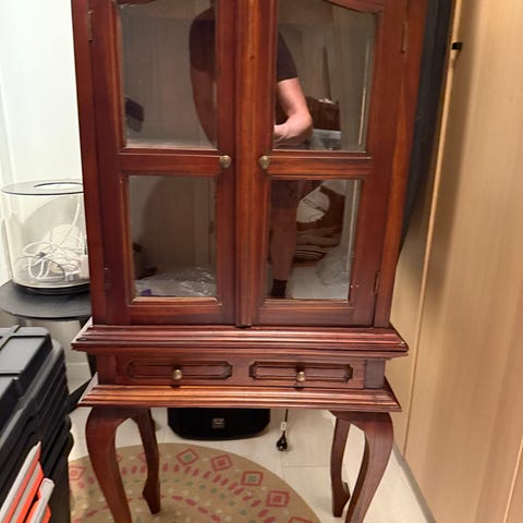 Vitrineskap i tre med glassdører og dekorative detaljer. Skapet har to glassdører øverst og to tredører nederst med låsbare håndtak. Passer til oppbevaring og visning av gjenstander.Beskrivelsen, som er KI som harlaget, passertilnærmet greit. Om ere vil ha mer info så ta kontakt. Skapet befinner seg på Jevnaker. Kan leveres på strekningen Jevnaker - Oslo tilavtalt pris. Prisen er en ca- pris. (Det er lov å by mer om du syntes dette var da rimelig)