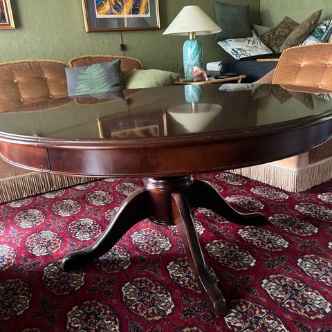 Pent brukt ovalt spisebord i mahogny/nøttetre utseende selges rimelig. Stilmøbel i Hepplewhite-stilen.