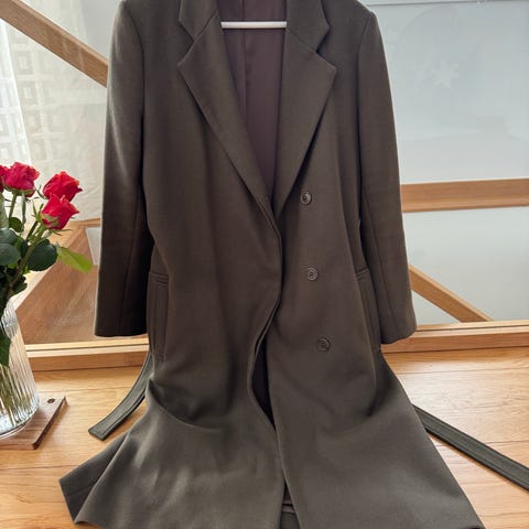 Filippa K Kåpe i rosa farge, i ull. Kåpen er i størrelse L. Den har belte i livet og knappelukking. Noen av trådene til knappene bør fikses av en som er bedre på sånt enn meg - se bilde😊