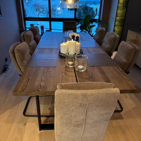Spisestue fra Jakobsen Home kjøpt på Bohus. Spisestuen er off-white, med «slitte» detaljer. 8 stoler som er gråspettet med off-white ben. Veldig gode å sitte på.