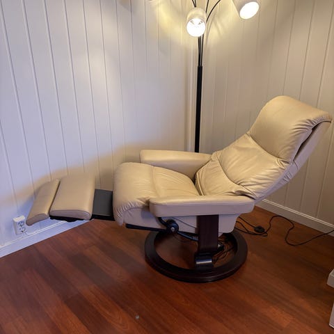 2 gode stressless i skinn med skamler. Reguleringer: sving, legg ned rygg, nakkedel kan heves og senkes samt endre posisjon fremover etc. Merke CB.