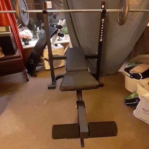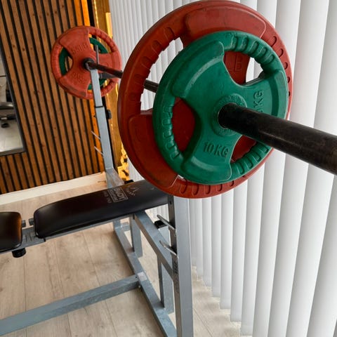 Treningsbenk med justerbar ryggstøtte og sete, egnet for ulike styrkeøvelser. Settet inkluderer flere manualer og vektstenger med ulike vektskiver, som gir mulighet for variert trening.