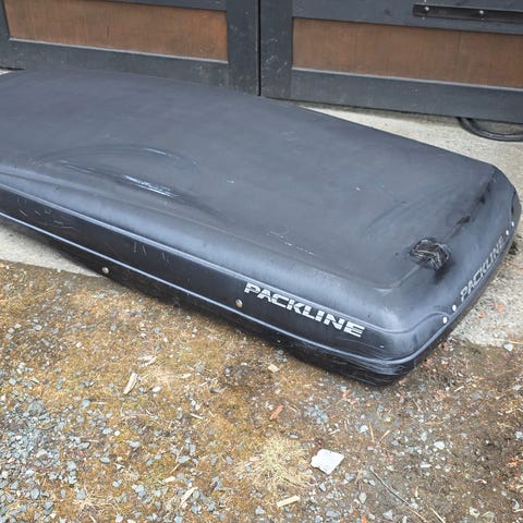 Praktisk og fin skiboks selges uten takrails/takfeste dem er defekt på den, mulig at dem kan fikses. Packline! 2.10m lang. 30cm høy. Med låsing av kapelen. Kan justeres fram og tilbake 30cm. Trenger en vask