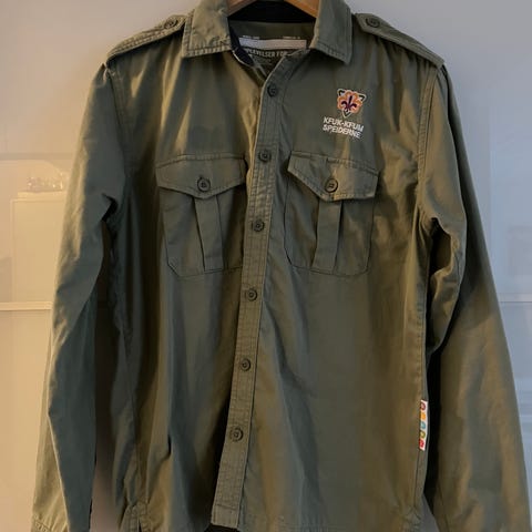 KFUK-KFUM Speiderne barn skjorte i størrelse 8, grønn farge. Skjorten har knappelukking og brodert logo foran. Materialet er slitesterkt og egnet for utendørs bruk. Det er synlige bruksspor, inkludert to reparasjoner på ermet.