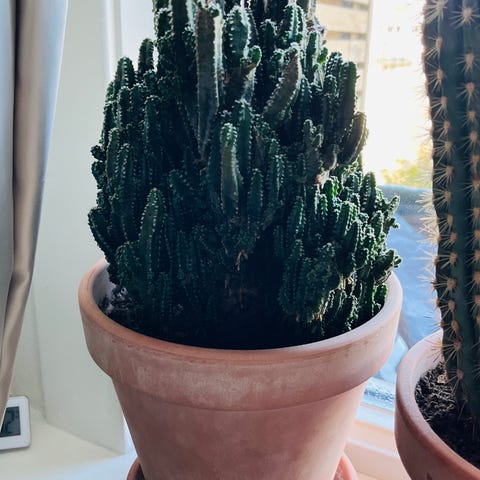 Litt usikker på hva den heter, men det er en sukkulent som har vokst litt og kunne trengt litt kjærlighet med ompotting. Det er en avstikker (andre bilde) for den som kunne tenkt seg å lage en plante til mens man driver med ompotting :)