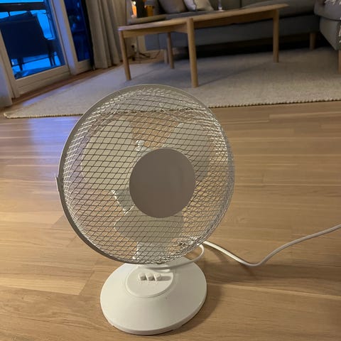 Clas Ohlson Tower Mini vifte i hvit farge. Viften har flere hastighetsinnstillinger (Low, Mid, High) og er designet for å gi luftsirkulasjon i mindre rom. Den drives med strøm via ledning og har standard spenning på 220-240V, 50Hz.