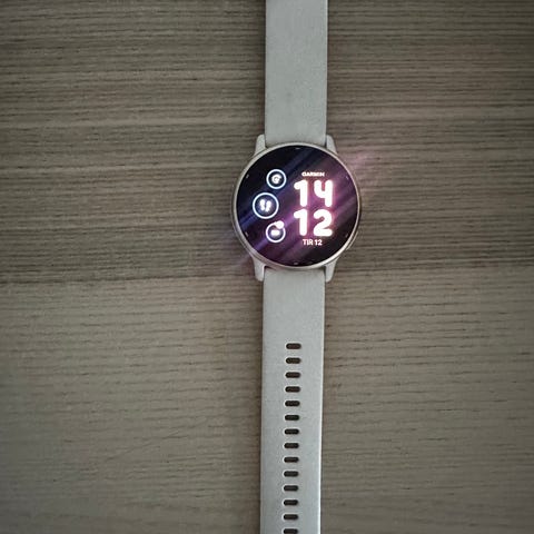 Klokken funker som den skal, kjøpt april 2025. Noen riper i skjermen og litt slitt reim.
