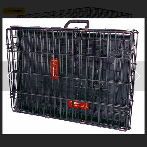 Buret er sammenleggbart og har et bærehandtak på toppen for enkel transport. Bunnen består av en avtakbar plastplate for enkel rengjøring. Designet for å gi et sikkert og praktisk oppholdssted for hunder på reise eller hjemme.