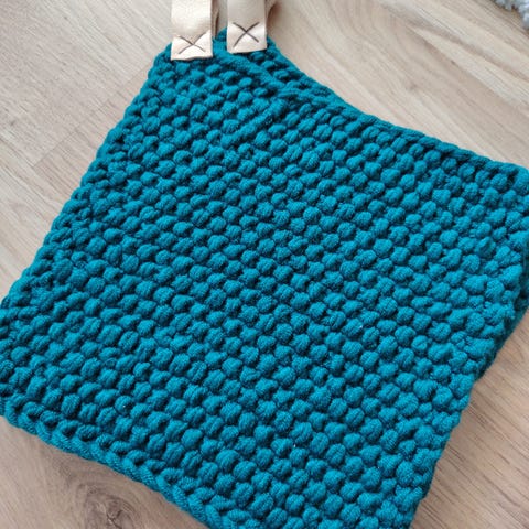 Håndlaget strikket gryteklut med grønn og hvit farge. To lærstropper som oppheng. Strikket i 50% bambus og 50 % akryl. 19,5 x 19,5 cm.