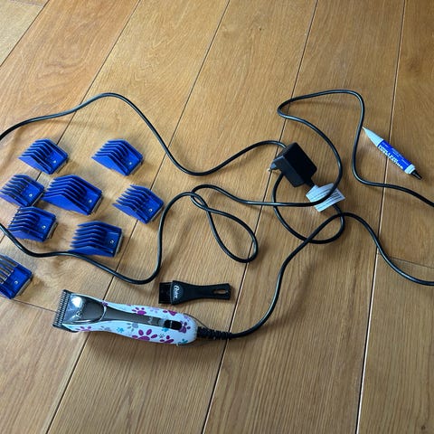 Godhund håndholdt hundehårfjerner med tilbehør. Produktet inkluderer flere børster og dyser for effektiv fjerning av hundehår. Egnet for bruk på kjæledyr for å redusere håravfall i hjemmet.