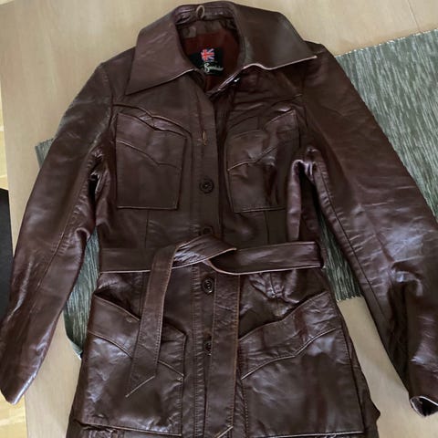 Flott ubrukt retro skinnjakke kjøpt i London på 1980-tallet. Modellen på bildet er str. Small/UK10, så jakken vil sitte pent på en dame i str. M/42. Kan evt. hentes på Sørumsand.