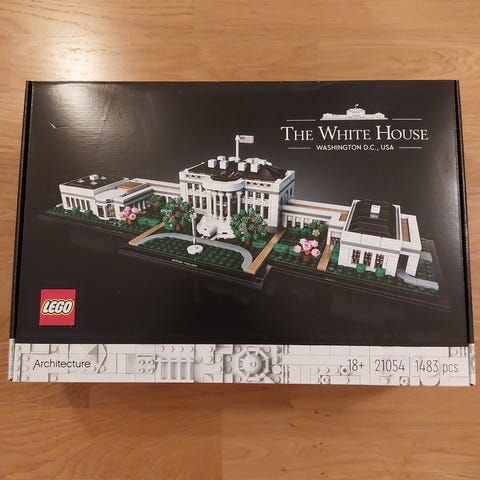 LEGO Architecture The White House modellbyggesett som gjenskaper den ikoniske bygningen. Settet inneholder detaljerte elementer som representerer den historiske amerikanske presidentboligen, inkludert hager og flagg.