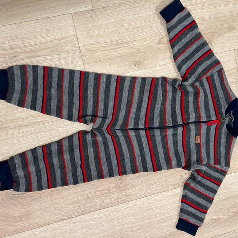 Den er lite brukt og ikke brukt i barnehage. Veldig pent brukt og vasket på ullprogram 1 gang nå før salg. Litt misfarget nederst ribbekant på beina, men har ikke prøvd flekkfjerning. Se bilde.