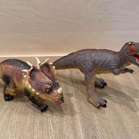 Selger et dinosaurleketøy som lager realistisk «råår/vræl‑lyd når du trykker på den. Leken er laget av myk plastikk, har fine farger og er i svært god stand.