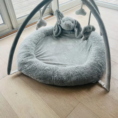 Søt, myk babygym i pent design. Både hengende deler for når baby ligger på rygg og leker sydd inn i matten for lek på mage. Lett å henge på ekstra deler. En gul flekk