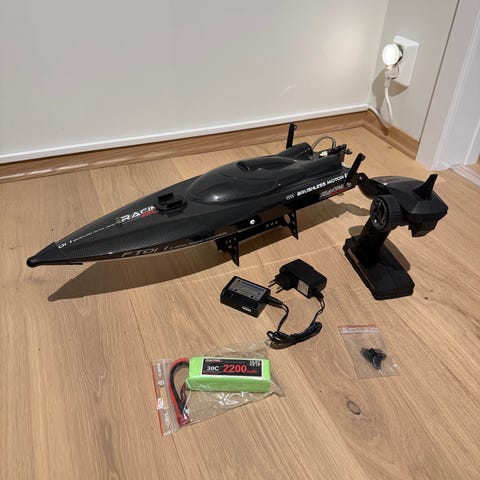 UDI gallop radiostyrt båt til ferskvann. Pent brukt 2-3 ganger. Hel og fin. Følger med stativ som båten kan stå på, ekstra propell og beskyttelse til båtens front.