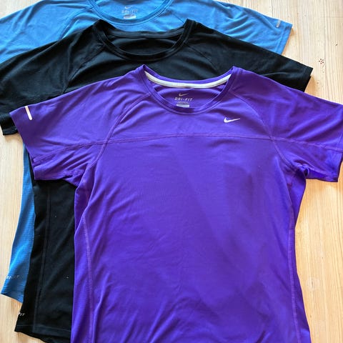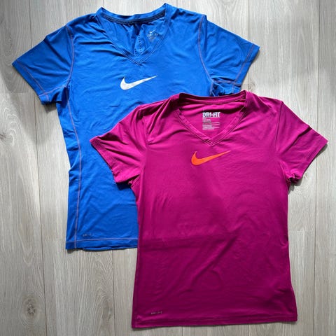 Nike T-skjorter i størrelse XS. Den svarte er XS, den røde er S. Fremstår rimelig like i str.