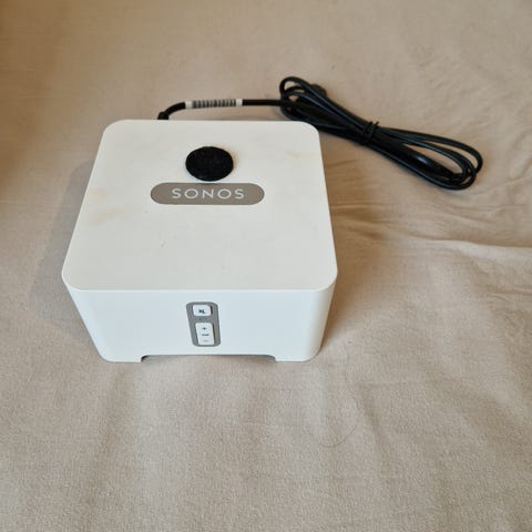 Sonos i hvit farge. Enhet med flere tilkoblingsmuligheter inkludert Ethernet, optisk lydinngang og analoge lydutganger. Produktet har kontroller for volum og demping på fronten. Denne gjør at man kan koble eldre anlegg til Sonos og dermed Spotify, internettradio etc 500kr/bud