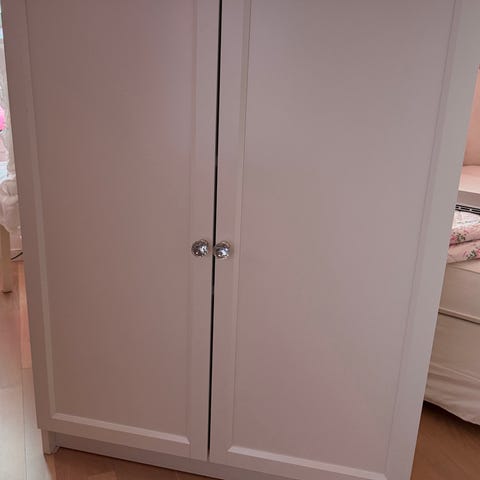 Skap med to dører i lyst tre. Inneholder flere hyller, klesstang og to skuffer nederst. Egnet for oppbevaring av klær og andre gjenstander.