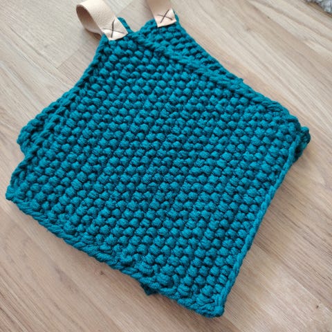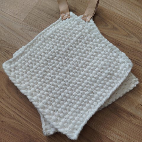 Hjemmestrikkede hvite grytekluter i 50 % bambus og 50 % akryl. Stropper i lær. 19,5 x 19,5 cm.