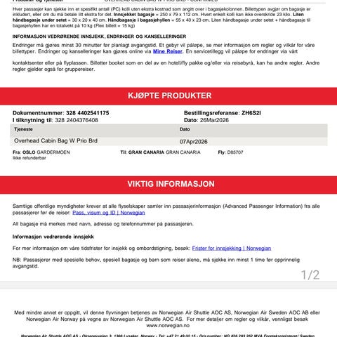 Flybilletter Evenes-Gran Canaria til 2 voksne. Avreise 21. april kl 06:15 med ankomst Gran Canaria kl 14:15. Retur fra GC 28. april 15:05, ankomst EVE 29. april 10:20.