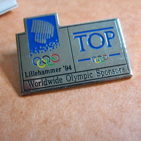 Sett med 3M-sponsorpins fra OL i 1992. Settet inneholder åtte emaljepins i en fløyelsforet presentasjonseske.
